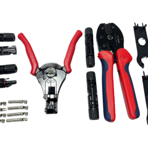 Kit Ponchadora profesional para conectores MC4 de paneles solares con pelacable integrado. Crimpado preciso, rápido y seguro para instalaciones fotovoltaicas.